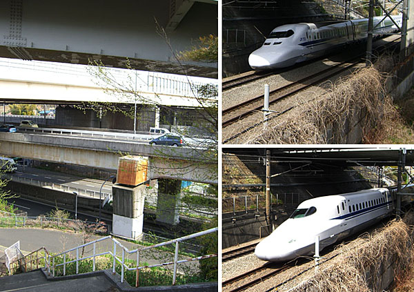 三枚町の交差点まで下り環状2号線を横断する。このあたりは道が立体的に交差している。自転車を停めて脇の急階段をのぼると新幹線の線路が見える橋にでた。5分ほどまっていると猛スピードの新幹線が通過していった。