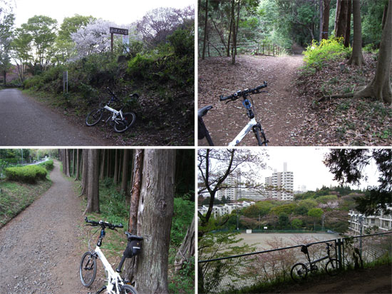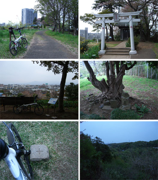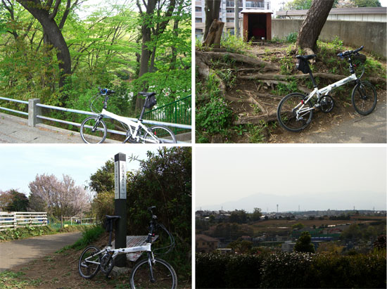 先週の尾根伝いに四季の森公園の続きという感じで横浜市緑区にある高尾山(標高100.46m)まで走行してみた。昼すぎに出発。滝の川跡の遊歩道などを走行して片倉町から三枚町との尾根道にのぼる。今日は天気はまずまずだけど丹沢や富士山は見えない。