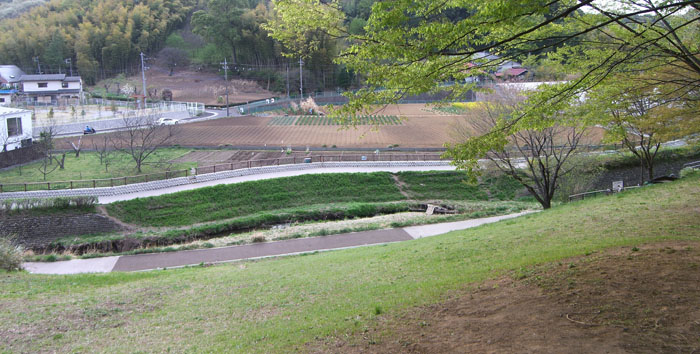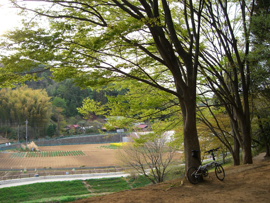 信号を右折して環状2号線から離れると鄙びた感じの風景になってくる。青蓮寺前を通過し坂下バス停先の細道へ右折すると羽沢町公園にでた。公園のベンチでちょっと休憩。園内の小径を辿ってみちなりに進むと羽沢町農業専用地区へ続く道にでた。農道を通って大通りにでる。とりあえず右折してみると東泉寺前にでた。脇の急坂をのぼると見覚えのある菅田の農業専用地区が広がっていた。外周を半周し丸舗装の急坂を下るといでと公園にでた。園内に整備された小川が流れていて子供が遊んでいる。広場の奥に階段があり林の中へ続いているようだ。脇に獣道がつづいていたので自転車を押しあげてのぼってみる。のぼりきると小さな広場のような空間があった。前から現れた親子連れに「ここはいでと公園ですか」と訊ねられたので「そうです。階段を降りると広場になってますよ」と答える。このあたりは地形が複雑なので迷いやすいのだろう。