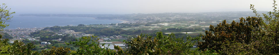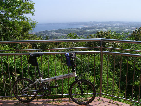 車が数台止められるような広場になっていてこの奥から未舗装路が続いているようだ(1330)。ハイカーらしき人が歩いてきたので砲台山はここを行けばよいか訊ねてみた。どうやらそうらしいので安心して出発することにする。緩い未舗装のつづら折りの道が続いているが無理せず押し歩きしていくことにする。木陰が多く有難い。通信研究所の建物が眼下に見えてきた。畑の脇を抜けてひとのぼりすると尾根道にでた。案内標識には←三浦富士 武山・砲台山→となっている。一瞬三浦富士にもよってみるかとも思ったが今回はやめておくことにした。このあたりから平坦基調となったので乗車していけなくもなさそうだったけど引き続きのんびりと押し歩きしていくことにする。見晴らし台という案内標識がある。そのまま進んでいくとほどなく見晴らし台に到着(1400)。なかなかの眺めだ。三浦海岸方面が良く見える。もうちょっと標高が高いと城ヶ島あたりまで見えるのだろうが…。