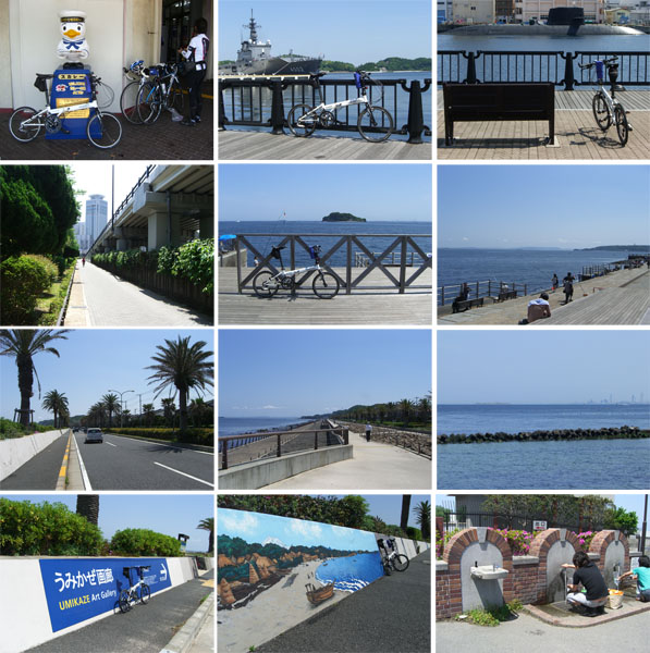 ここから先はトンネルが続く区間だ。吉倉公園入口という信号で左折して公園によってみる(1000)。海でも見えるのかなと思ったが運動場と遊具のある普通の公園だった。運動場では少年野球が行われていて賑やかだ。土手の上を横須賀線が通過していく。トンネル手前を左折して横須賀駅前に下る(1006)。駅前には輪行してきたらしいロードバイクの人がいた。ヴェルニー公園からは災害派遣に向かうらしい海上自衛隊の輸送艦“しもきた”が停泊しているのが見えた。5分ほど休憩。気温も上がり暑くなってきた。うみかぜ公園から猿島を眺める。馬堀海岸の遊歩道脇にはうみかぜ画廊などというものが新たにできていてなかなか綺麗なペイントがされていた(以前は小学生のペイントだったか)。走水水源地あたりの駐車場内にあるヴェルニーの水という湧水で水分補給(1056)。