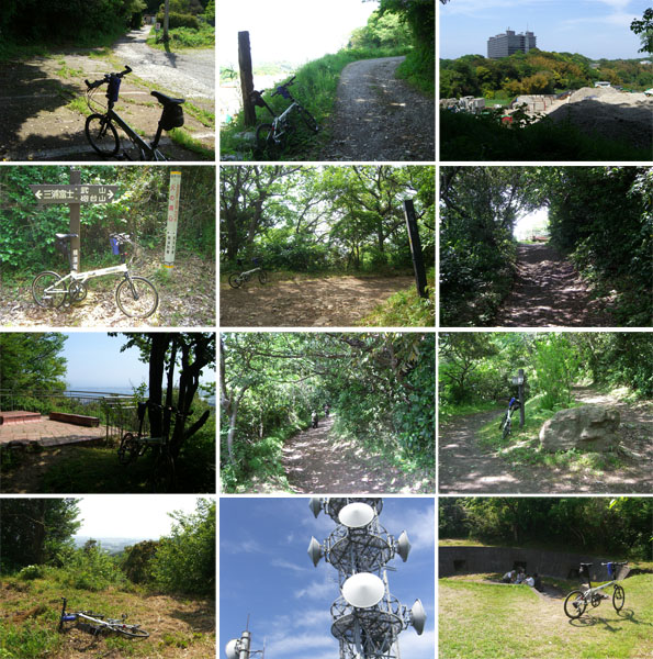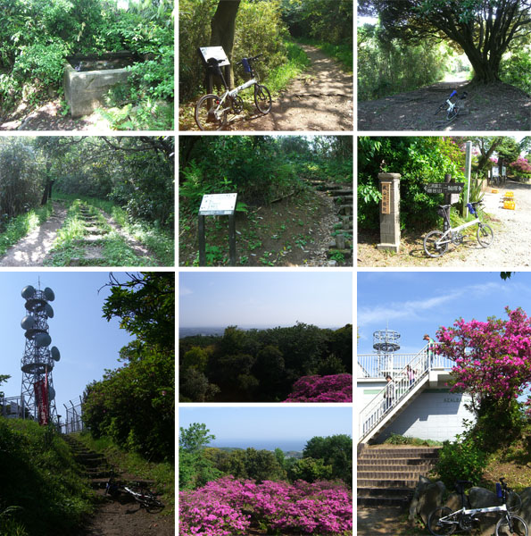 きた道を乗車して分岐地点まで下ってみる。かなりでこぼこで振動が伝わってくる。分岐地点まで戻りここからは無理せずまた押し歩きしていくことにする。下りとなって水が溜めてある石桶のあたりは階段が出現。注意して通り抜けると平坦となった。しばらく進むと急な階段が現れた。担ごうかと思ったが横に轍があったので押し上げることにした。上からハイカーが下りてきた。すれ違いざまにガンバレーあと少しと声をかけてくれる。もう少しだと思いながら押し上げていくと標識がたっていたので一休み(1431)。左へいくと津久井浜観光農園にでるらしい。このあたりからさらに急傾斜となり苦しくなってくる。ひとのぼりすると前方にアンテナが見えてきた。なんとか頂上に着いたようだ(1435)。大楠山の階段よりのぼりにくかったかも。