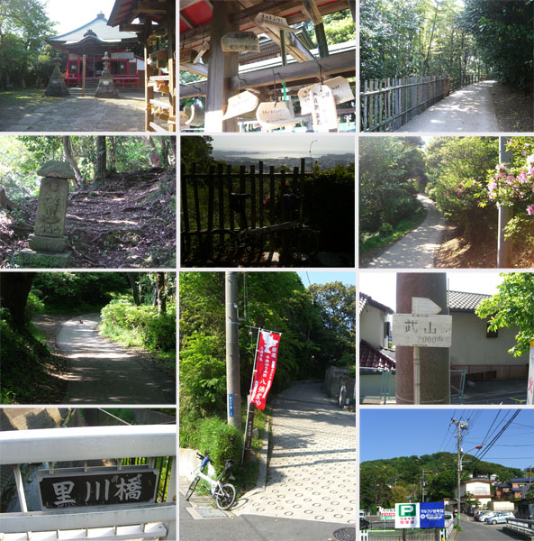 展望台付近にはつつじが咲いていて綺麗。黒い蝶が飛んでいたので写真におさめようとしたがなかなか難しくあきらめた…。武山不動院の絵馬には震災復興祈願する絵馬がおおくかかっていた。頂上には30分ほど滞在して下山することにする。頂上付近は緩い道だったが途中から半端ではない急傾斜となったので押してくだることにする。場所によっては30%超の勾配だったのでは…。途中には関東の富士見百景に選ばれている展望地点などもあったが今日は富士山はみえず…。道路の真ん中に猫がいたりする…。無事下山(1521)。“武山ここから2000歩”などという案内板がある(約1.3kmほどか)。地図を確認。右折して道なりに下っていくと県道にでた。手前の橋は里川橋と表示されている。振り返ってみると武山が見える。標高は200mほどだが運動不足気味の身体にはややしんどかった。