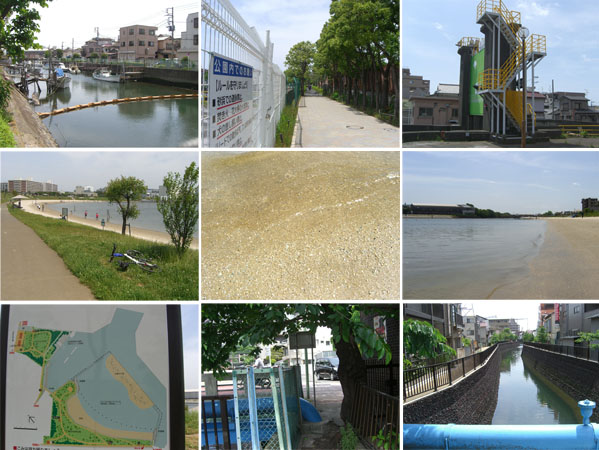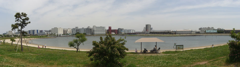 平和島口先から脇道に入り内川を渡ってするがや通りという細い道へ入っていくと途中で二差路となる。ちょっと地図で確認するとどっちへいってもよさそう。とりあえず左の道へいく。つきあたりにふるさとの浜辺公園まで○mという案内板がある。右、左どっちからもいけるようだ。今回は右折してみる。ゴルフ練習場と運動場の外周をまわるとほどなく潮の香りが漂ってきた。左折すると公園入口だ。前方に水門が見える。浜辺公園ということでこじんまりとしているが砂浜が広がっている(1020)。金沢うみの公園より規模は小さいが想像していたよりは広い感じ。園内は外周の道以外は自転車乗り入れ禁止のようだ(遊泳も禁止とのこと)。ちょっと水分補給して休憩。相変わらず風が強いがまだ陽は出ている。気温はどんどん上昇しているようでかなり暑くなってきた…。正面が昭和島でその奥が羽田空港、左手方面に平和島で行き来できそうな感じだ。