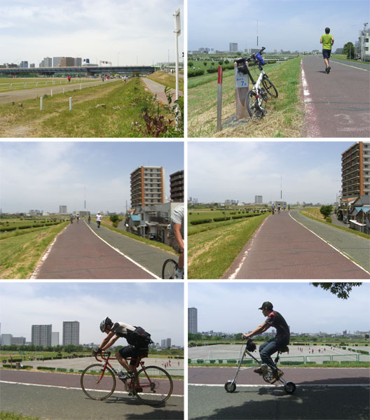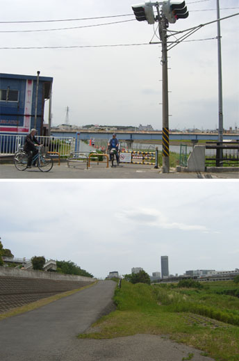 大森警察署前でR15号線へ復帰。六郷橋手前あたりで更に風が強くなってきた…。橋は渡らずに多摩川左岸のサイクリングコースを走行していくことにする(1100)。サッカー練習場前の土手上のベンチで休憩。腹が減ったので軽く補給する。休憩しているあいだに何台もの自転車やジョギングしている人が通り過ぎていく。15分ほどして出発。このあたりは川が蛇行しているので追い風になったり向かい風になったりする。ほどなくガス橋に到着。