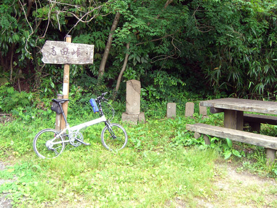 右折して民家の間を抜けると未舗装の道となったので自転車を押していくことにする。竹林が現れさらに進む。脇の畑で作業している人がいたので抜けられるかどうか訊ねてみる。急坂だけど抜けられるとのこと。つづら折れのみちとなり息をきらしてのぼるとほどなく頂上がみえた。入口にある標柱には“へいしの坂”と表示があった。