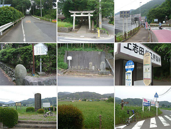 10分ほど休憩して出発。アップダウンをこなして気持ちよく走行していく。馬渡橋まできてしまってからミスコースに気づく。地図で確認すると角田(すみた)大橋バス停手前に関東ふれあいの道の道標があるところ曲がるのだった。なんだか引き返すのも面倒だし手前の愛川中学校方面への道をのぼっていくことにする。上志田というバス停がある。もうひとのぼりするとちょっと開けた場所に三増合戦場の碑と四阿がある(1150)。周辺はのんびりとした里山の風景だ。