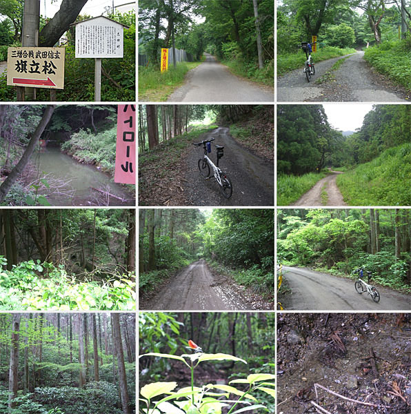 5分ほど休憩後に志田峠という道標に沿って進んでいく。突き当たって左折したあとは道なりに行けば志田峠らしいが不安になったのでまたもや地元の人に遭遇したので訊ねてみるとこの道でよいとのこと。周辺住民の○○反対という幟が何本か道沿いにはためいている。ゴルフ場の入口を過ぎて少しすると未舗装路となったので押していくことにする。小さな池があったりちょっと水が滲みだしたりして若干ぬかるんでいるところが多い。何やら羽虫(蚊?)につきまとわれだしたので手ではらいながら進む。
