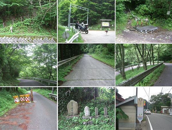 峠は切り通しになっていて少し下ると仏果山や経ヶ岳への登山道入口がある。ゲートの前ではオートバイの人が休憩中。またもや犬が一匹うろうろしている。さきほど遭遇した仲間らしい。猟犬なのだろうか? 犬に追い回されたりすると厄介なので写真を撮って早々に下ることにする。ということで県道から峠までのんびり写真撮ったりしながらで40分ほどかかったようだ。標高は500mほどで距離は県道から約4.8km。ノンストップで休憩なしだと30分ぐらいかかりそうだ。