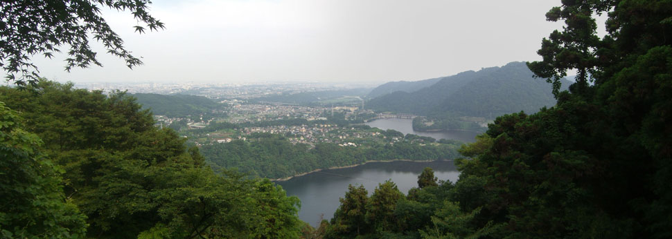 さらにくだっていくと津久井湖と街並みが望める絶景ポイントにでた(1459)。どうやら峰の薬師に到着したようだ。今回のクライマックスにふさわしい感じの見事な眺めだ。晴れていれば横浜のランドマークタワーやら都内方面が見晴らせるらしい。小倉橋あたりがよく見えていた。絶景を眺めているとトレイルランニング?している人がかけ降りてきた。境内には鐘や石像や姿三四郎決闘の場などという石碑がありちょっとした広場になっている。