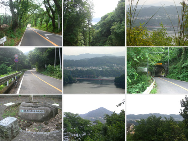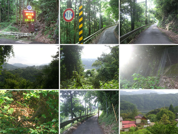 民家の間をぬけてほどなく道路情報の電光掲示板がある(1554)。“県道515、通行注意、落石、三井〜名手”と表示されている。ちょうど沢の上で少し冷んやりとしているかんじだ。幅員1.7mの道路標識と鉄柱がたっている。交通量も少なく多少アップダウンはあるが気持ちよく走行していける。前方からハイカーが歩いてきてこの先に猿がいると教えてくれた。先へ進むとがさごそと音がするので上を向くと金網ごしに日本猿?が移動しているのが見えた。5〜6頭の群だ。小猿もいてかわいらしいがなんだか危なっかしい。自転車で走行中に野生の猿に遭遇したのは初めてだ。なんだか得した気分。道路脇にちょうど湧き水があったので顔を洗い何口か飲んでみる。冷たくておいしい。ついでにボトルの水も空に近くなっていたので補給しておく(1605)。再びゲートの柱が現れ林道区間終了。少し下ると眼下に名手橋らしき橋を確認。あそこまでこれから下るのだ。