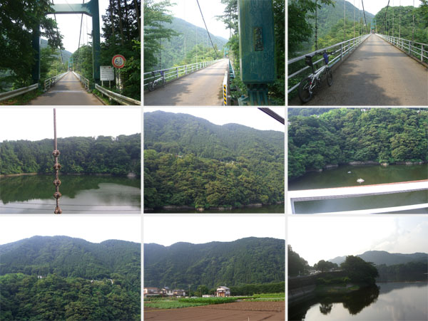 下っていく途中の奥に細い道が続いていたのを確認。確か土砂崩れで通行止めになっている道へ続いているのだろう。今回はもう遅いので曲がらずにそのままみちなりに下っていく。下りきると前方に薄緑色の吊り橋が見えた(1612)。欄干が低いのでちょっと下を覗くと結構高さがあるので恐いが…。橋から今通ってきたらしい道が見えている。橋を渡り津久井湖南岸の国道にでる(1623)。夕方の帰宅時間帯ということでやや渋滞している。津久井湖城山公園前を通過し橋本駅方面に向かうことにする(1633)。