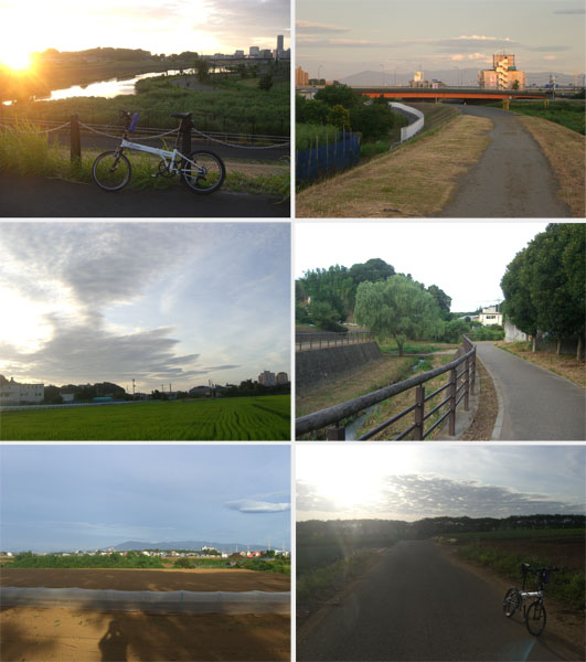 連休最終日、連日猛暑が続く中早起きしてヤビツ峠まで走行した。午前4時半すぎ日の出とともに出発。今回は表側からのぼるのは暑いし辛いだろうということでずいぶんと久し振りに宮ヶ瀬湖経由で裏側からのぼってみることにした。新横浜から鶴見川右岸沿い、落合橋で合流している恩田川沿いをしばらく走行するがパンクするとやっかいなので途中のスロープで土手下に降りる。都橋で川沿いに復帰し田園地帯を抜け梅田川沿いの遊歩道を行くことにする。R16にでて海軍道路をちょろっと走行し脇の田園地帯へ降りてみる。正面に丹沢をのぞみながら走行、振り返ると海軍道路の桜並木が朝日に照らされていて綺麗。