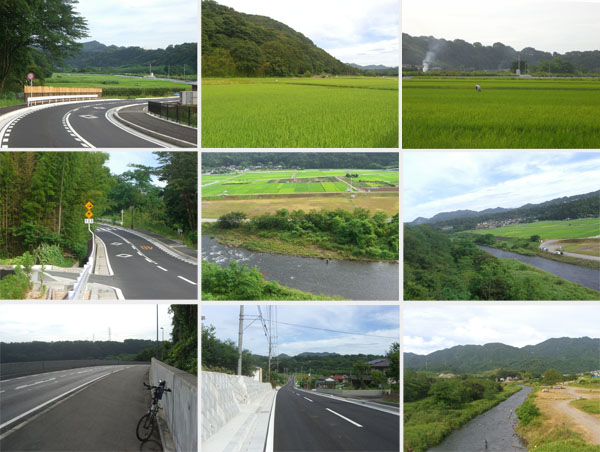この先、新しく開通したらしい右岸沿いの道を走行してみることにする。道路脇に水田が広がっている。ほどなく8%という勾配標識があらわれる。ひとのぼりして頂上付近の歩道に自転車を停め道路側に降りて眼下を眺めてみる。先日通った道や中津川の流れが広がっていてなかなかの眺めだ。9パーセントの勾配標識が現れ気持ちよく下っていくとほどなく丁字路につきあたる。右へいくと角田大橋、左へいくと平山大橋、R412方面に抜けられそうだ。とりあえず今回は右折して角田大橋を渡ってみる。