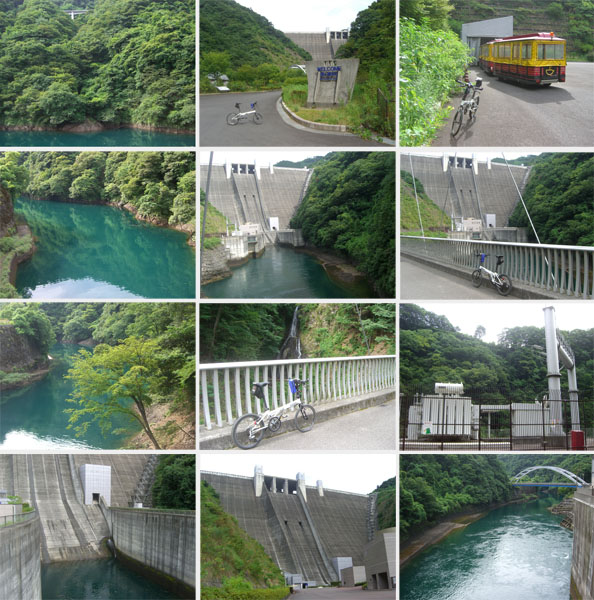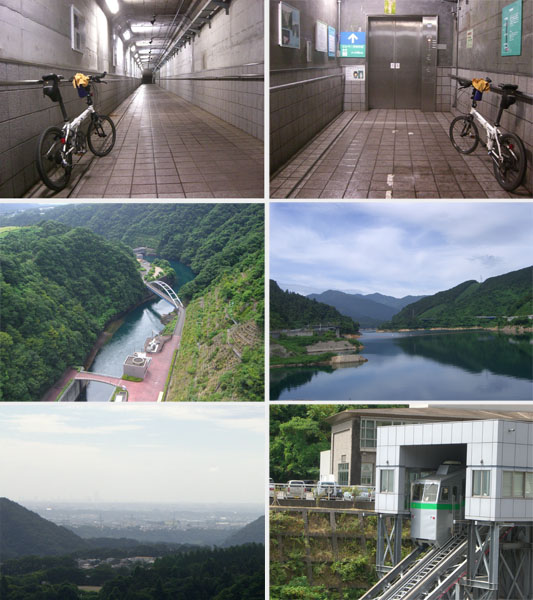 橋を渡ると左手に滝が流れ落ちていた(大沢の滝というらしい)。ダム真下までいくとエレベーターという案内板があったので中に入る。空気が冷んやりとしていて涼しい。トイレがあったのでちょっと用を足すことに。奥へと進んでいくと階段につきあたった。担いであがるとエレベーター前にでた。時刻は8時58分。エレベーター前で待っていると二人連れの観光客がやってきた。壁に貼ってあったものを眺めていたらエレベーターきましたよと呼ばれたので乗り込む。1分で上までいけるらしい(高さ約156m)。ダム堰堤上まで上昇して表にでるとむっとして暑い。急な気圧の変化で耳鳴りもする。横浜のランドマークタワーはシルエットがぼんやりと見えていた。