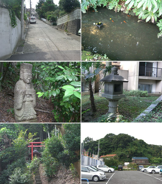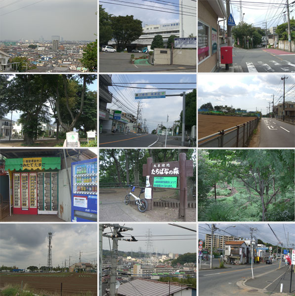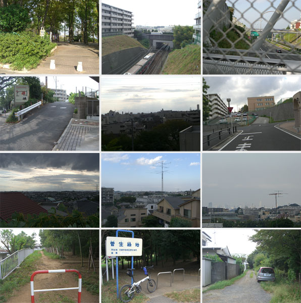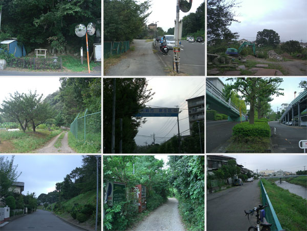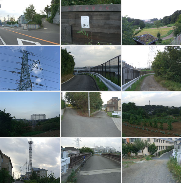 ここから尾根伝いに走行していくとほどなく井田病院前にでた。何やら工事中のようで柵がしてある。二差路を左折して道なりに進んでいく。こもれび公園、ここで地図を確認。この先の二差路を左で道なりでいいらしい。下田町・蟹ヶ谷の尾根道を走行していく。大通りを横断して再び市境の道。川崎側は団地、横浜側は畑地となってきた(高田町・久末)。前方にアンテナが見えてきて複雑な交差点にでる。横浜市港北区・都筑区、川崎市高津区の境界地点らしい。さてどっちにいけばよいのだろう。自動車は直進していくようだが…方向的には…付近をうろうろしているとたちばなの森入口にでた。下をのぞきこむと階段がつづいていて遊歩道が整備されている。地図を確認するとやはり右手のアンテナの建っているほうにいけばよいらしい。細い急傾斜な道となり中原街道の久末交差点付近にでた。とりあえずここで一区切りといった感じだ。