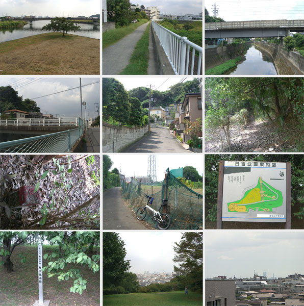最近できた巨大ショッピングセンター脇を抜けて樽綱橋から鶴見川沿いにでる。鷹野人道橋を渡り矢上川合流地点から奥の橋まで走行する。矢上川沿いは未舗装路で結構がたがたなので今回は日吉の住宅地を抜け矢上小入口まで走行する。再び矢上川沿いに復帰してパソコンショップなどに寄り道した後再び矢上川沿いに戻る。綱島街道を渡って上田橋から川沿いを離れて日吉公園方面に上る。公園内に舗装路が続いていたようだが今回は市境の獣道へ自転車を押し上げていく。日吉公園からは川崎?武蔵小杉?方面の眺望が開けていた。