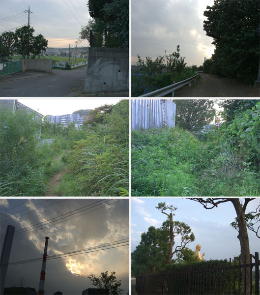 さらに下り早渕台公園前を通過し大通りにつきあたったので右折すると日吉の辻という交差点まできてしまう。このあたり交通量多く道も狭いの走りづらい。地図を確認してUターンしたま日吉台病院裏手の道へはいる。未舗装路となって虹ヶ丘団地付近にでる。直進してすすき野2を右折し虹ヶ丘団地バス停先の陸橋のところを左折し団地の中を抜ける。車止めを抜けて通りにでて右折、先の信号を直進。つきあたったら左折して早野聖地公園外周沿いに走行していく。右手側に短い上り坂があらわれるのでのぼる。左折するとほどなく未舗装路となり自動販売機と民家が1軒、さらに進むと草が生い茂っているが道が続いているかんじだ。今回はとりあえず薄暗くなってきたのでここでUターンして次回に探索してみることにした(ここは右折だったようだ)。