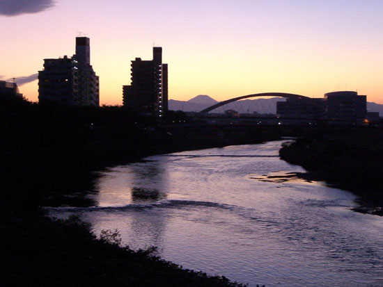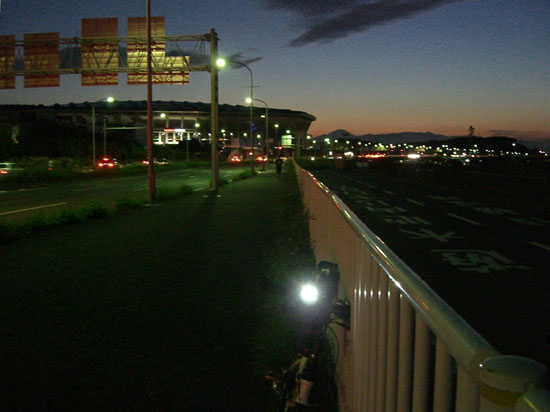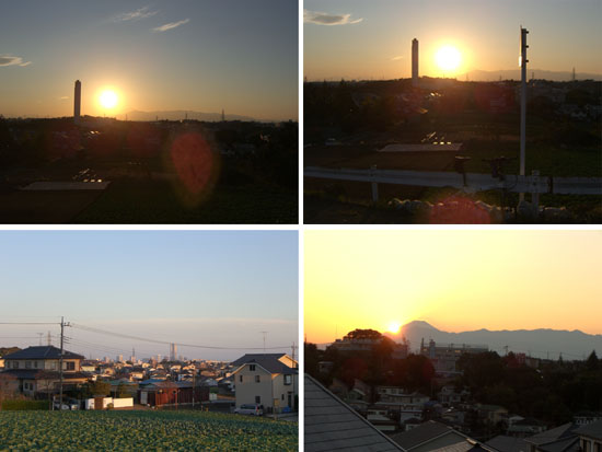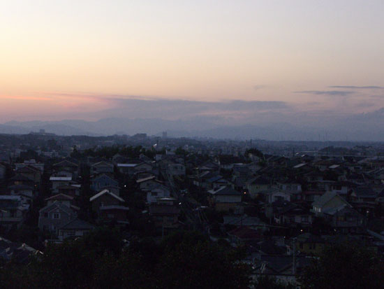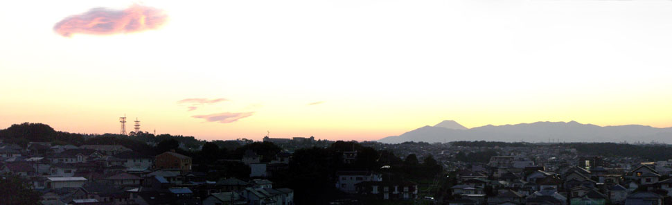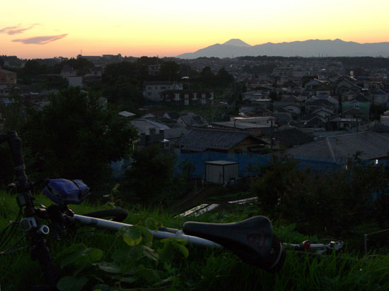 まだ日暮れまで時間がありそうなので前回と同じようなコースで瀬谷方面に向かうことにする。アップダウンをこなして東名高速の町田インターチェンジあたりから境川沿いに出る。遊水池公園まで走行すると日も暮れてしまいそうなので大和橋で川沿いを離れR16号線で今回もまた尾根コースで帰ることにする。前回曲がった交差点を通りすぎてしまったのでもう一つ先で左折。えっちらとのぼっていくと小さな公園につきあたった。裏にまわると細い道が続いていたのでのぼると見晴らしの良い畑地にでた。すでに陽が沈みつつあり遠くに丹沢の山並みと富士山が綺麗に見えていた。