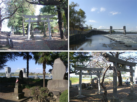 橋の先からは舗装されていたのでそのまま直進、急なスロープをのぼり土手上へ復帰。多摩水道橋の手前、二ヶ領せせらぎ館前のトイレで休憩。結構汗びっしょり…。手前にある神社によってみる。川原のほうに降りて二ヶ領宿河原堰を眺めてみる。鳥が堰の中央付近の石にたくさんとまっている。20分ほど休憩して出発。