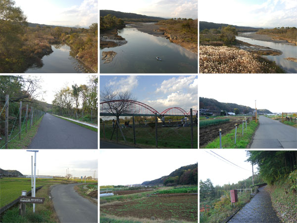 この橋は国道16号線が通っているので凄い交通量だが橋から見える景色はなんとも自然な感じの風景だ。ちょうどカヌーで川を下っている人が通過。右折するとゲートがあるが開いている。この先長い直線道路を走行していく。日陰でひんやりとしているせいか肌寒い。前方に赤い水道管橋?が見えてきた。両脇が運動場になっていて野球やテニスを楽しんでいる。道はさらに先へ真っ直ぐ続いていていた。ほどなく分岐地点にでる。周囲は農業地帯になっている。標識があり右・東秋留駅方面、左・都立滝山公園とあったので左折して滝山公園方面に向かってみることにする。すぐにお地蔵様と庚申塔がある分岐地点にでる。直進して細い道をのぼっていく。路面が湿っていて林道っぽい区間を抜けると先ほどまでいた運動場が見晴らせる場所にでた。さらに先へと道は続いている。