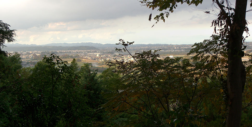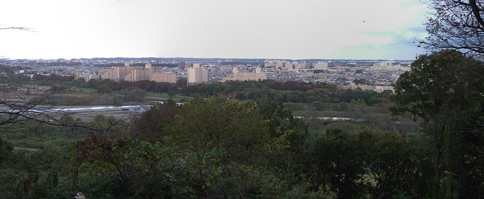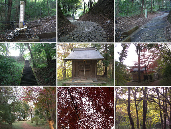 丸舗装の急坂となり突き当たると都立滝山公園の入口に着いた。この先さらに急坂で石畳、濡れていて苔ですべるという状態。どうしようかなと迷っていると人が下ってきた。まあとりあえず進んでみるかということで自転車をひきずって一部担いでスリップしないようにのぼっていくとさっきの人がまたのぼってきたのでこの先まだ長いのですかねと訊ねてみた。その先を曲がればもうすぐですよというのでやや安心。それにしても歩きにくい道だ。さすが城址というだけあるな…。こんなところで槍でも降ってきたらいちころだろうななどと思いながら進むがとりあえず今回は脇の林に自転車を置いて散策してみることにした。前方に橋が見えた。その手前に急な石段がある。なにやら石段の脇に座りこんで絵を描いている人がいる。脇の急な石段をのぼってみる。神社の境内らしきところにでた。右手には多摩川の流れや秩父方面?が見晴らせた。