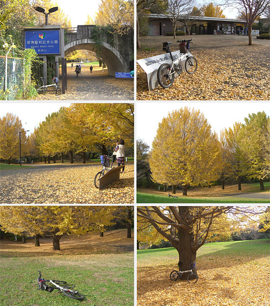 とりあえず川沿いに道が続いているので上流に向かう。中央線のえらい狭い高架下をくぐると川の様子が変わってきた。水が流れていないのである。まさに残掘といった感じ…。そのまま川沿いを進むと行き止まりになってしまった。川はここで方向転換して北に向かっているようだ。とりあえず橋を渡って(ここを右折して坂道をのぼって通りにでるとよいかも)高架下にでるが階段で上へあがるようだ。ちょうど人が降りてきたので昭和記念公園へ行く道を尋ねてみる。ここを上がって直進し踏切2ヶ所渡るとすぐらしい。自転車だとぐるっと迂回しないといけないようなので面倒だということで今回は階段を突破することにした。結構長い階段、息を整えて出発。直進して突き当たりの交差点を右折するとすぐに踏切があった。その先を左折するとまたもや踏切があり奥には昭和記念公園の黄葉した銀杏が見えていた。踏切を渡って左にいくと残堀川が見下ろせた。ここでもやはり水が流れていない。不思議な川だ。信号を渡ると昭和記念公園前の橋で残堀川は園内を抜けていくようだ。園内の橋の上を自転車が走行している。サイクリングコースがあるようだ。時刻は11時54分となっていた。