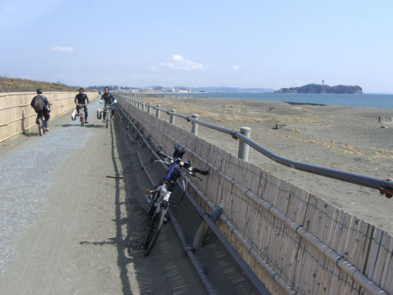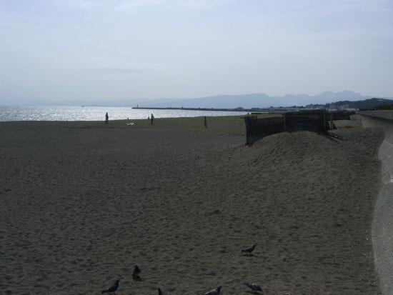 15分ほどで終点の休憩所に到着。まだまだ元気なのでなかなか快調だ。ここで3分ほど休憩して出発。藤沢橋にでて県道30号線で浜須賀方面に向かうことにする。藤沢警察署前の二差路での信号はやや面倒だ。辻堂海浜公園に1時すぎに到着。藤沢橋から30分はかかっていなかっただろう。公園内は春といった感じで大勢の人が遊んでいた。園内を抜けてR134上を通って湘南海岸にでる。やっぱり相模湾はいいなあ。