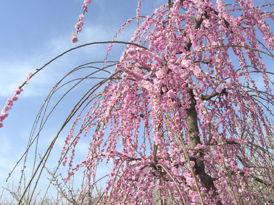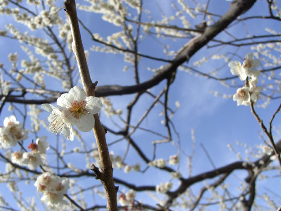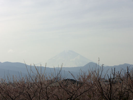 岡入口の信号で呼吸を整える。釣具屋さんの奥のほうにトンネルが見えている。トンネル(東海道線高架下)を抜けると神社前にでた。国道とはうってかわって静かでほっとするがほどなくガソリンスタンド先で県道と合流する。民家の庭先の梅も見頃といった感じでなかなか綺麗。小さな丘をひとつ越えると梅林の入口らしき場所にでた(1452)。曽我別所梅林信号の脇に案内板がある。脇の道をのぞいてみると梅林らしきものが見えたのでいってみることにする。天気も良く青空に箱根の山並をバックにたくさんの梅の花が満開ということでなかなか綺麗。