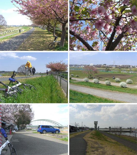 等々力緑地を経由して多摩川にでる。土手に植えてある河津桜が満開で綺麗。第三京浜、二子橋を通過し二ヶ領せせらぎ館前に到着。5分ほど休憩して多摩水道橋下を抜け再び土手上へでる。ここまでやや風が強かったが春到来といった感じで気持ち良い。