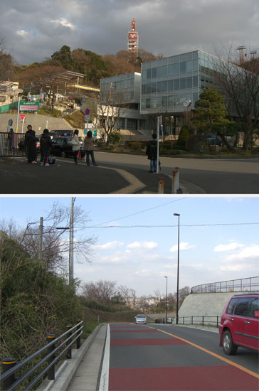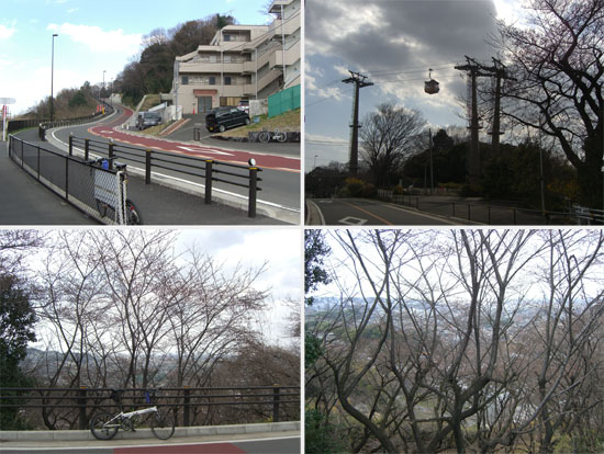 地図を確認すると右へ行くと多摩川原橋、直進すると連光寺で左折で尾根幹線道路にでるようだ。ここは左折してさらに榎戸交差点で左折し三沢川を渡ると右手に巨大ショッピングセンターがある。前方に京王相模原線の高架が見えている。高架下の一方通行の道へ左折すると読売ランド駅前にでた。前方に新しくできた道(読売V通り?)が丘にむかってのびているのが見えた。ややきつめの直線の坂をのぼっていくと左手側の眺望がひらけてきた。ヘアピンカーブ手前の歩道部分に見晴らしポイントがある。カーブを曲がると若干傾斜も緩くなるが最後にまたややきつくなり頂上にでた。前方頭上をゴンドラが通過していく。疲れた…。