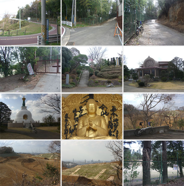 急坂をのぼっていくとお寺前に到着。急な階段が上に続いている。ゴルフ場沿いに直進していけそうだったけどちょっと右手の坂をのぼってお寺によってみることにする。お寺の境内には仏像を納めたちょっと変わった様式の白い建物が目に入ってきた。奥に行くとなにやら造成中のような広い土地が広がっていた。下に降りられるのかと道を下るとフェンスがあり行き止まりとなっていたので引き返す。トイレがあったのでちょっと使用させてもらった。