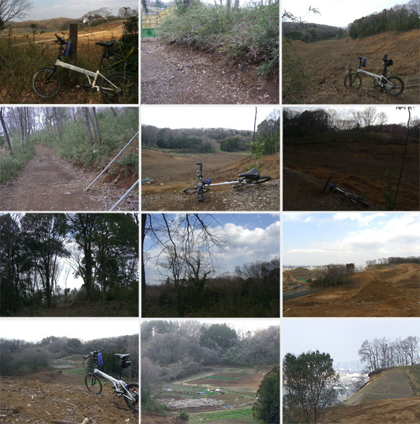 お寺の入口まで戻りゴルフ場沿いの道を進んでいくことにする。ここからは未舗装路だ。ややのぼり基調の道をがたがたと走行していくと分岐地点にでた。右手の方は崖があるため行き止まり?という看板がある。ということで直進していくと軍服?を着てバーベキューをしている集団の横を通過。ほどなく行き止まりとなってしまった。しかたがないので戻ろうかと思ったら道に矢印がペイントされている。茂みのほうを差しているのでちょっとのぞいてみるとフェンスの向こうにでられるらしくその先へ道も続いている感じだ。降り口が2mほどの崖になっているのでフェンスの支柱に捕まり注意しながら突破する。里山っぽい風景がひろがっていた。ここからのんびり押し歩きしていくことにする。倒木の横を抜けて道なりに進み大きな木立の間を抜けると急に視界が開けた。