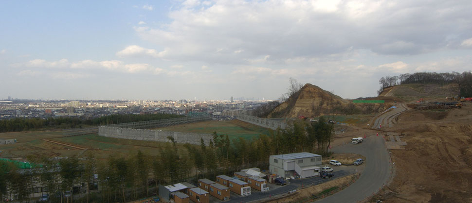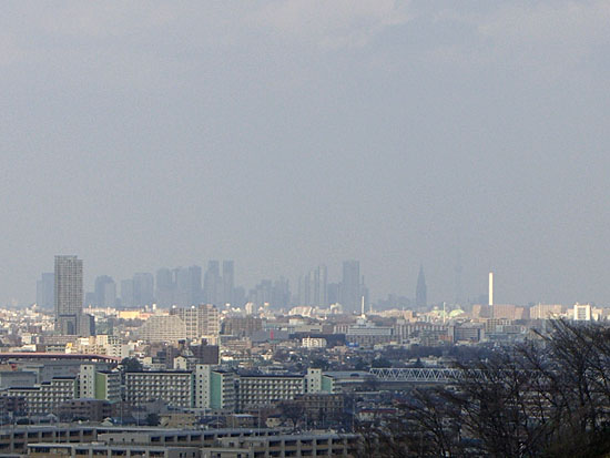 小径にでて右手にすすみ竹林の横を通過すると道路脇にフェンスがしてある場所にでた。下をのぞくとこのあたり崖になっているようだ。フェンス脇から崖上にでてみると東京都内方面がなかなかの眺めだ。スカイツリーもぼんやりとだが見えている。