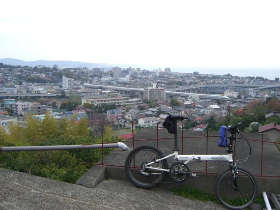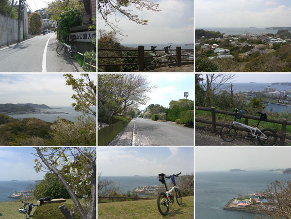 時計をみると11時20分。ちょっと急いだほうがよさそうだ。野島に渡り夕照橋を渡って六浦方面に向かう。裏道を走行して六浦駅前から六浦トンネルへとのぼり気持ち良い下り。線路沿いを走行して逗子駅北口前を通過。線路の反対側にでたいと思って走行していると小さな踏切があったので渡る。左折して小坪入口を右折すると緩いのぼりとなり披露山公園入口に到着。ちょうど午後12時となった。写真撮影しているとロードバイクの人がのぼっていった。ここから頂上までは距離はそれほどないが急坂が続く(ルートラボによると標高差約64m、距離約800m、平均斜度約7.8%)…。駐車場付近までのぼるとロードバイクの人が折り返してきた。のんびりとのぼってなんとか足つきなしでのぼれた。疲れたが…。公園は休日とあって賑わっていた。天気はまずまずだが春霞といった感じで江の島は見えるが富士山は見えない。園内を自転車を押して一周して大崎公園に向かうことにする。曲がり角を100mほど行きすぎてしまいUターン…。豪華な披露山庭園住宅を抜けて下っていくと大崎公園入口に到着。人が前を歩いていたので自転車を押していくことにする。見晴らしの良いベンチで昼食休憩。とんびが上空を旋回している…。