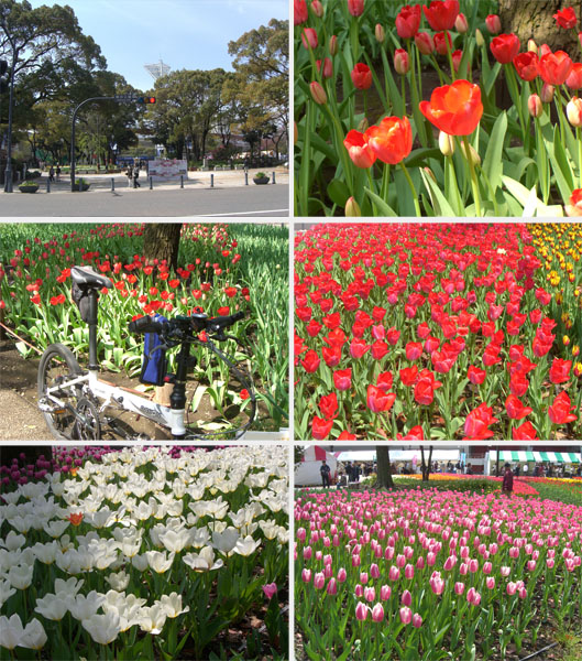 開港記念会館(ジャックの塔)前を通過し日本大通りを右折して横浜公園に到着。チューリップは一部満開のものもあったがまだ蕾のものも多いといった具合だった。赤、白、黄色といろいろと咲いている。目に鮮やかでキュートな感じ。結構人出もあり賑わっていた。
