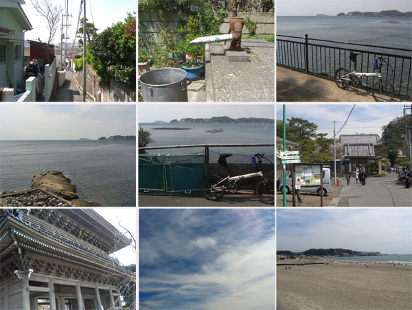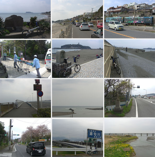 ●鎌倉市、稲村ガ崎にて(左上)/七里ヶ浜付近にて(上中・右上)/小動神社前にて(中上左)/藤沢市、江の島付近にて(中上中・中上右)/平塚市、湘南大橋にて(中下左・中下中・)/花水川橋付近にて(中下右)/二宮町、川匂神社入口にて(左下)/小田原市、酒匂橋にて(下中・右下)