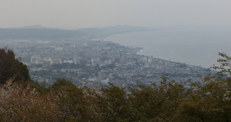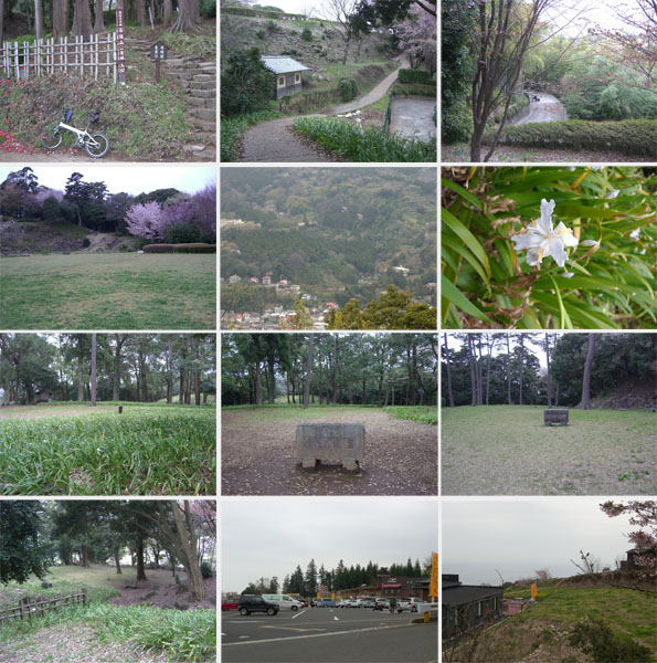 左手には駐車場とお店があった(ヨロイヅカ ファームという洋菓子店?だったらしい)。麓から写真を撮りつつ押し歩きで約30分ちょっとかかったようだ。右手に公園の入口らしき階段が続いていたがどうしようか…結局のぼって散策していくことにする。なかなか雰囲気のある小径を進んでいくと二の丸広場という開けた場所にでた。トイレがあったので顔を洗わせて貰う(汗が乾いてざらざらだ…)。奥の展望台方面に向かう。展望台からは眼下に国道1号線と山並みが見晴らせた。案内板によるとこれから行く紹太寺の枝垂れ桜も見えているらしい。二の丸広場に引き返してさらに本丸広場にのぼってみる。ここからは小田原市街と相模湾が望めた。ちょっと曇ってしまったのが残念だ。腹が減ったのでベンチに座って補給休憩。寒くなってきたのでウィンドブレーカーを着込む。