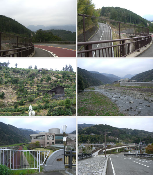 さて最後は長興山紹大寺の枝垂れ桜だがどうしようか。もう午後4時半となっている。まあそんなに遠くではなさそうなのでよってみるかということで反対側のR1方面に下る。こちら側は開通したばかりのような感じで路面が綺麗。やや急坂なので注意して下っていくと最後はコンクリート舗装のがたがた道になり橋の前にでた。下を流れているのは早川で地球博物館の建物が見えている。