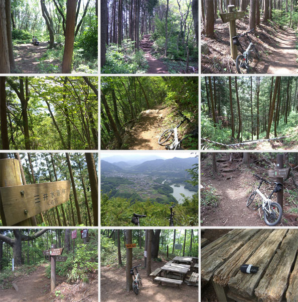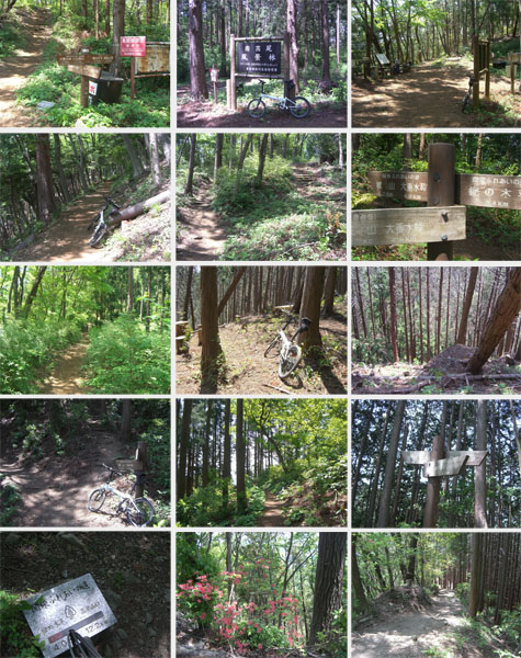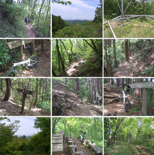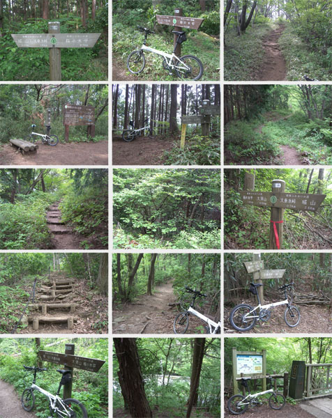 道も平坦基調になったので自転車に乗車してゆっくりと走行していくとほどなく三沢峠に到着した(1218)。南高尾風景林という大きな看板が目をひいた。脇にテーブルやベンチが設置してあって開けた空間になっている。案内板をみると大垂水峠まで4.9kmという表示がある。結構大変そうだ。ハイカーの人とちょっと話をして出発。まき道というほうにすすむ。道はひとがぎりぎりすれ違えるといった感じだ。とりあえず転倒して怪我したら大変ということでこの先ちょっと長いけどのんびり押していくことにした。前方から歩いてきた人がこの先アップダウンも激しいし崖状のところもあるので自転車では危ないから引き返しなさいなどといわれてしまう。自転車がこんなのでほとんど押し担ぎでいくので心配ないです。携帯電話の電波も入るようだし無茶はしませんので?大丈夫ですと返答するとなんとか納得?したようだ。まあ山道を単独行動というのはリスクが大きいというのは承知の上だが…。気を取りなおしてすすむことにする。今日は気温が高いせいか立ち止まると場所によっては羽虫がたかってきたりしてやや鬱陶しかったりする。左手に杉が植林されているベンチのある休憩ポイントに到着。昼時とあって昼食を食べている人が多い。眺望はそれほどないが木立を抜けてくる風が涼しい。階段を下って泰光山分岐に到着(1237)。