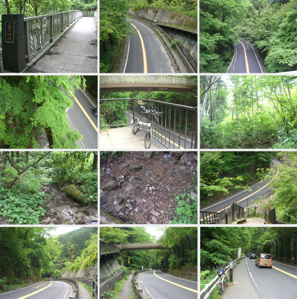 さああとは大洞山を越えれば大垂水峠ということで先へ急ぐことにする。大垂水峠へ1.6km地点通過(1406)、大垂水峠へ1.4km地点通過(1411)、山頂へ向けてのぼっていく。大洞山(536m)へ14時16分に到着した。ベンチで休憩している人がいる。さあこれで大きなのぼりは終了ということでほっと一息。大垂水峠までの下りはほとんど自転車を担ぐ区間となりしんどかった(肩にサドルが食い込んで痛かった…)。結構急な階段なので注意して下っていく。自動車のエンジン音が聞こえるようになり峠が近いことがわかる。ほどなく右下に国道が見えてきた。ちょっと不思議な感じだ。ほどなく見覚えのある茶色い橋の上にでた(1444)。大垂水峠橋というようだ。