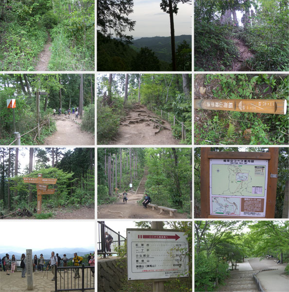 道標に従って高尾山頂方面にすすむ。細い道を進み崖状のところを足下に注意しながらのぼる。ほどなく稲荷山コースに合流した(1542)。ゲートからここまでくるあいだにカメラを担いだ人と遭遇しただけだったがさすがメジャーな山ということでここからは老若男女大勢の人が通行していた。林道よりも急傾斜でちょっと辛い。ほどなく山頂下の階段に到着(1551)。ちょっと一息ついてから階段をのぼりはじめる。何段あるのか結構長い…。ようやく山頂らしきところにでた(1558)。高尾山大見晴園地、関東の富士見百景という案内板がある。丹沢・道志方面の山並みが見えていた。空気が澄んでいて雲がなければと富士山も見えるらしい。