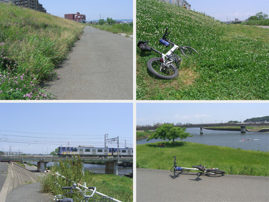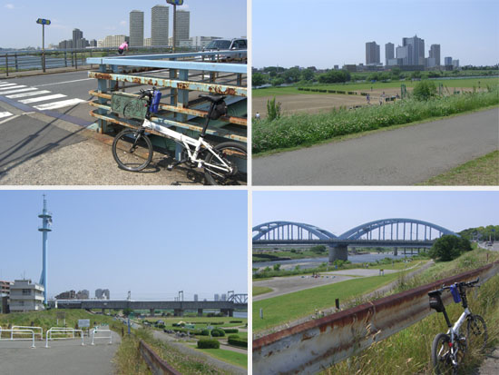 お昼近くに出発。若干遠回りだけど新横浜から鶴見川経由でのんびりといくことにする。亀甲橋から左岸沿いに走行。土手下に降りて新羽橋のアンダーパスを通過。早渕川合流地点前で土手上にあがる。左岸は支流との合流が多く迂回するのがやや面倒。綱島大橋手前で再びアンダーパスに降りる。矢上川合流地点から今回はちょっと違ったルートで多摩川にでてみることにする。