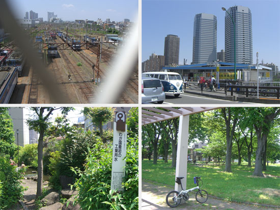 矢上川橋を渡りそのまま直進。信号を横断してさらに直進すると小倉緑道入口にでた(緑道までいかずに手前で左折してもよいだろう)。南加瀬交番から一方通行の細い道を通って夢見ヶ崎動物公園入口脇の路地を走行。大通りにでたら左折して跨線橋を渡り新川崎駅前にでる。右折して踏切を渡り鹿島田駅前から平間浄水場前へでる。二ヶ領用水脇を走行して川崎工科高校外周沿いに上平間交番前へでる。大通りを横断すると公園があったので小休憩。平間公園というらしい。
