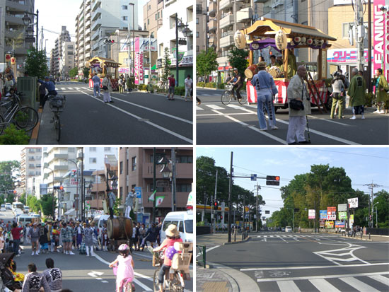 さてここで引き返してもよいのだがせっかくなのでまだ行ったことのなかった小金井公園に向かうことにする。野川沿いに戻って上流に向けて走行していくとコンクリートの凸凹路面に…。新前橋から小金井街道で北上しJR中央線武蔵小金井駅前を通過すると太鼓やお囃子の音が聞こえてきた。何かのお祭りだろうか。