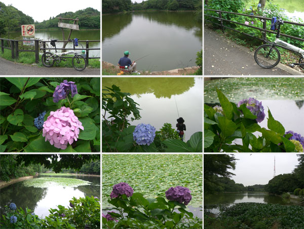 雨足がやや強くなってきた。園内では普段は釣り禁止のようだけどブラックバス防除ウィークという青い幟がたっていて釣り竿を垂らしている人がいた。