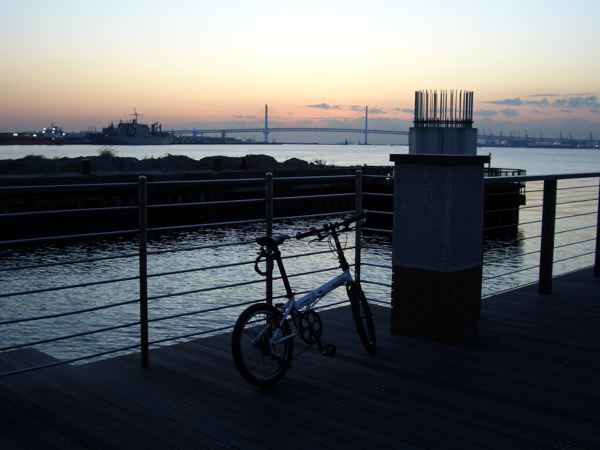 辺りは既に薄闇となっておりがらがらの車道を寒風の中こぐとほどなくコットンハーバーのプロムナードに到着した。人影も多くもなく少なくもないといった程度。できたばかりなのでわりと穴場だったようだ。臨港パークのような開放感などはないがちょっとした遊歩道が海沿いに数十メートル続いていた。