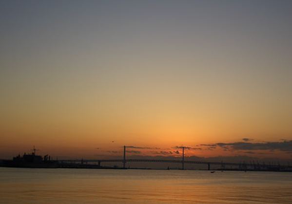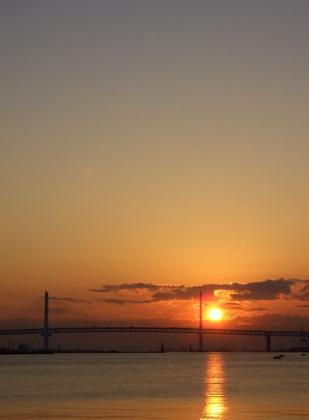 太陽が徐々にのぼり雲の切れ目から頭をのぞかせた。陽光が海面に細長く反射し神々しい初日の出をベイブリッジごしにのぞむことができた。
