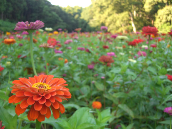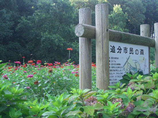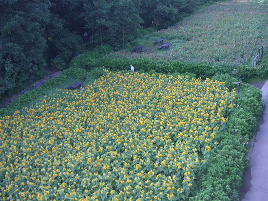 落合橋からアップダウンは激しいが境川まで最短コースで(三ツ沢からR16経由がさらに約2kmほど短くのぼりも緩いが)ということで中原街道にでる。久々に長坂をのぼる。結構しんどい…。さらにアップダウンをこなして下川井インターを通過し再びのぼる。旭大橋から下の追分市民の森を覗くと黄色と赤の花が咲いていたので階段を降りて寄り道していくことにする(0654)。黄色い花は東北八重ひまわり?というちょっと変わったものだった。ざっと橋の下を散策して戻る。