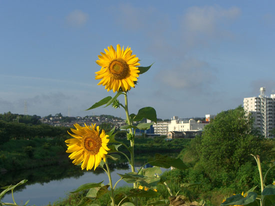 今回も先週に引き続きトレーニング的?に境川遊水池公園まで走行してみた。午前6時過ぎに荷物は最小限にして空身でサドルバッグにあんパンをしのばせて出発。新横浜にでて今回は小机大橋から鶴見川左岸沿いを走行していくことにする。第三京浜高架下あたりは野良猫が多い…。鴨居近辺ではサイクリングコース脇にちらほらと向日葵が咲いていた。夏真っ盛りである。